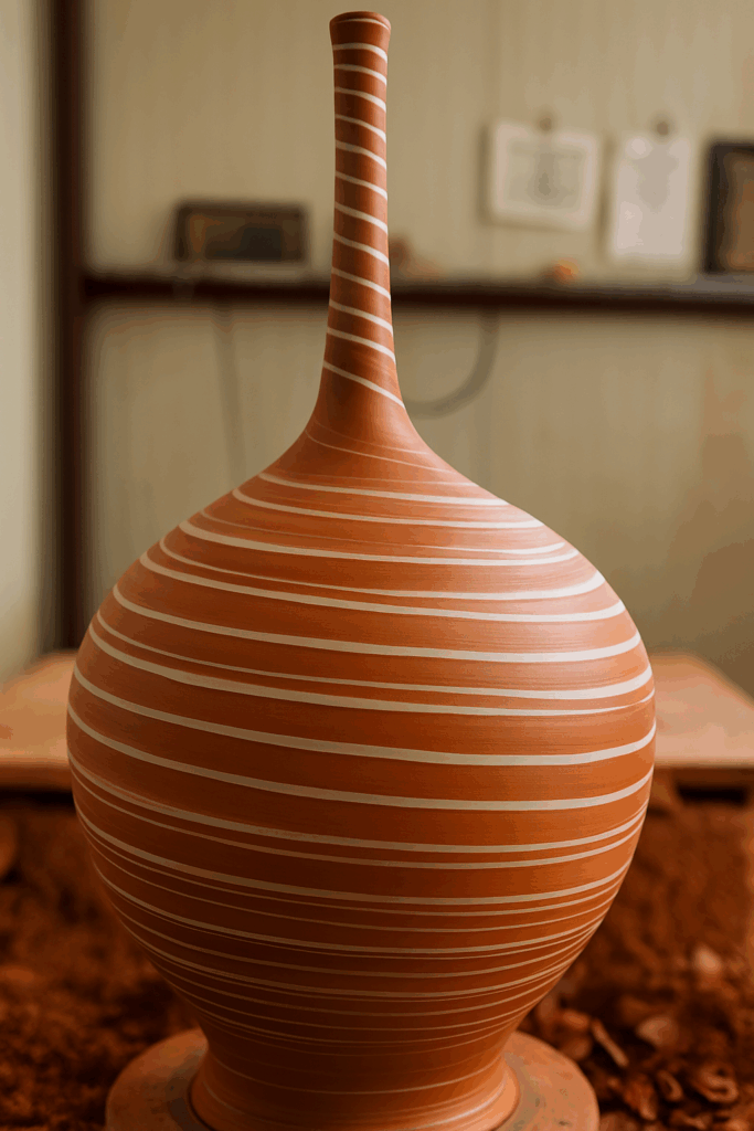 Geleneksel kırmızı kilin sıcaklığını, modern çizgisel estetikle birleştirir. Geniş gövde ile zarifçe yükselen uzun boyun arasındaki denge, ustalıklı torna işçiliğinin bir göstergesidir. Yüzeye uygulanan beyaz spiral çizgiler, formun ritmini güçlendirirken esere hareket ve dinamizm katar.